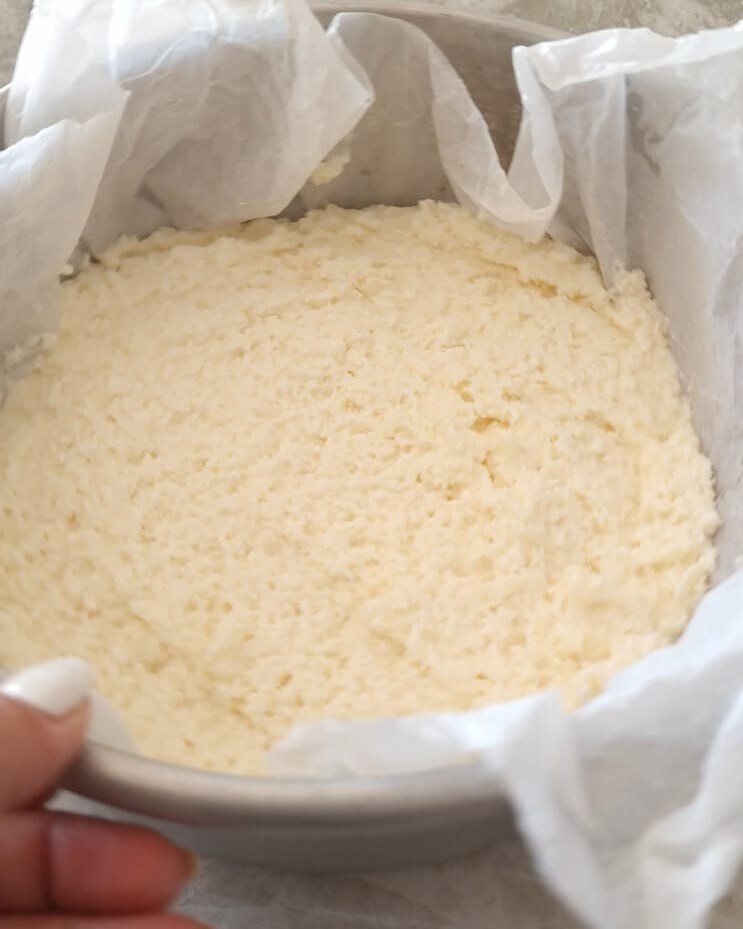Pegue a ricota e escorra o soro, depois adicione ao composto.