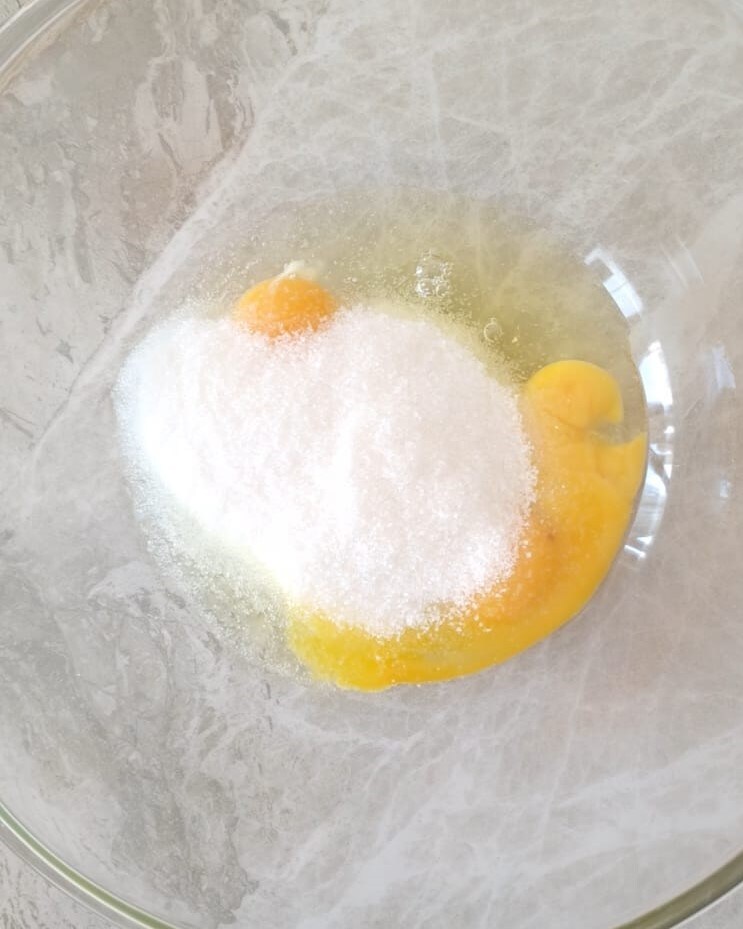 Em uma tigela grande, bata os ovos com o açúcar usando um batedor.