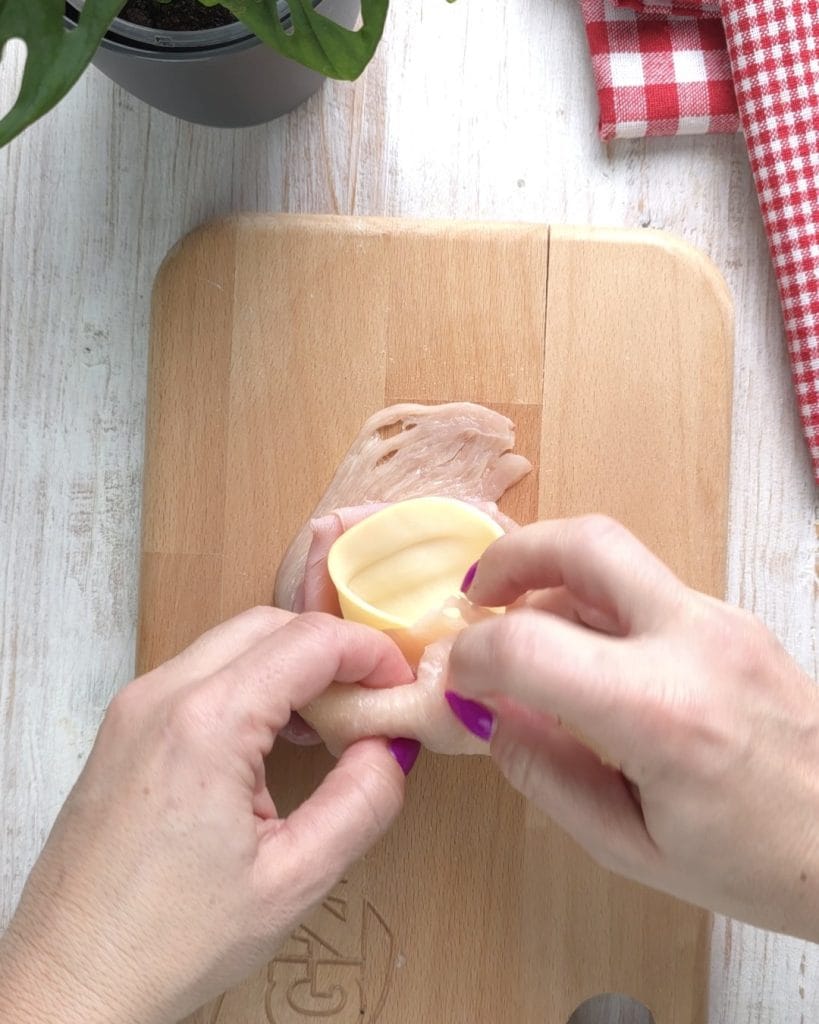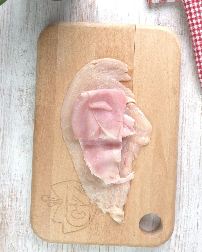 Pegue as fatias de peito de frango, amasse-as levemente com o batedor, só se necessário, depois recheie com uma fatia de presunto e uma de queijo.
