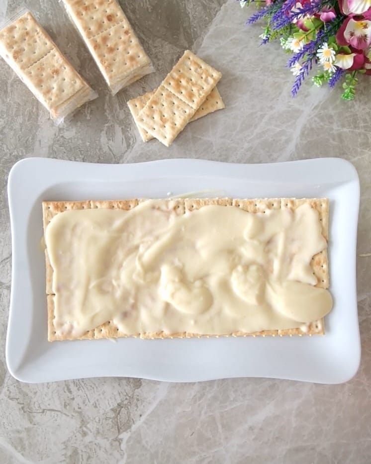 Neste ponto, pegue uma assadeira ou um prato de servir. Disponha 9 crackers para formar a base do diplomata, em seguida, espalhe por cima algumas colheres de creme de confeiteiro.