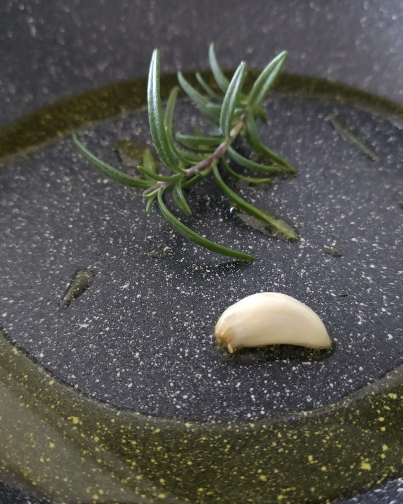 Em uma frigideira, coloque o alecrim, um fio de azeite e um dente de alho.