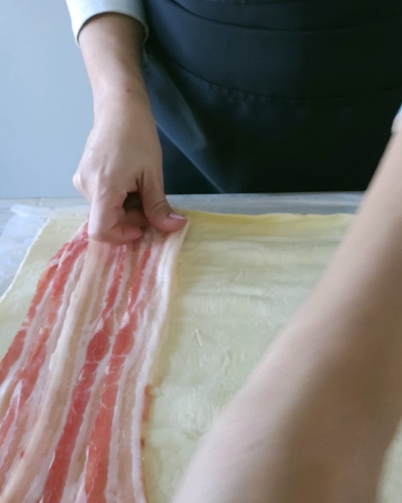 Enquanto isso, desenrole a massa folhada sobre a bancada e coloque as fatias de bacon sobre a massa, sobrepondo-as levemente.