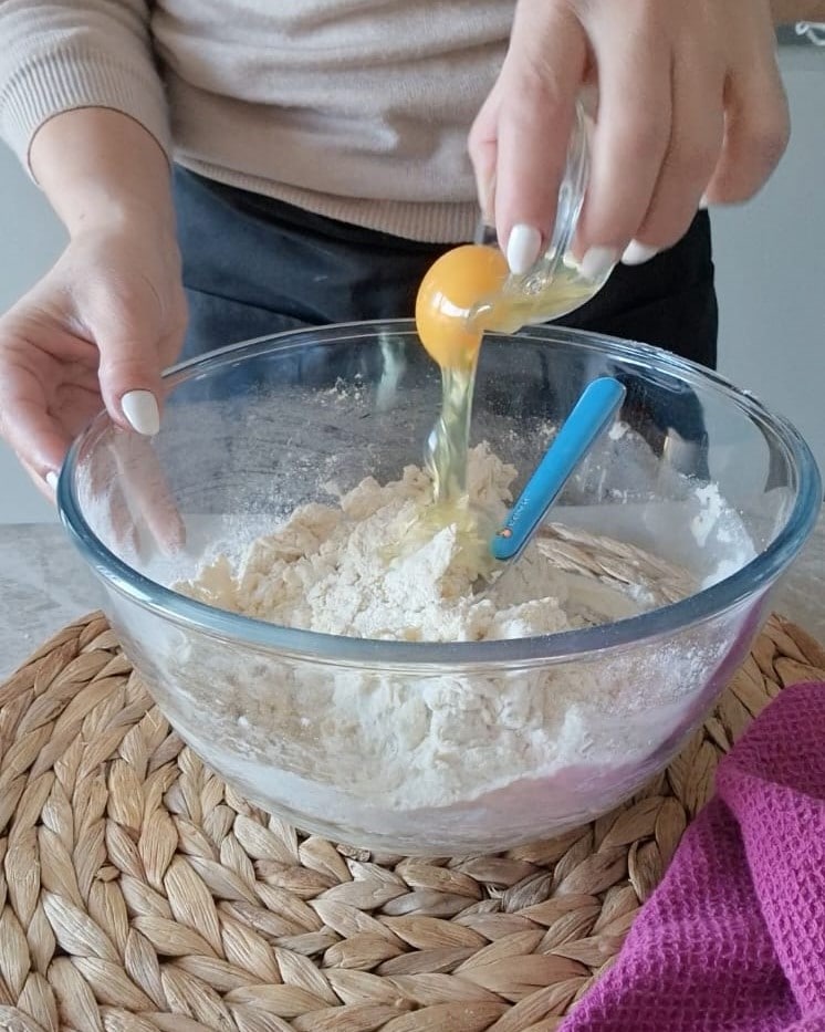 Coloque em uma tigela grande a farinha, o fermento e o ovo.