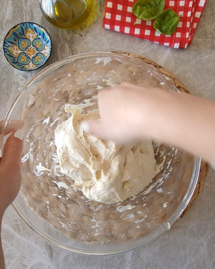 Após o tempo de descanso, faça as dobras, sempre dentro da tigela, puxando as extremidades para o centro.