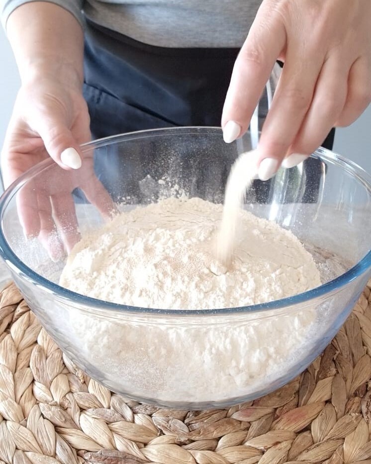 Depois de misturar as farinhas, cubra a tigela com filme plástico e deixe o composto descansar por cerca de 15 minutos em temperatura ambiente.