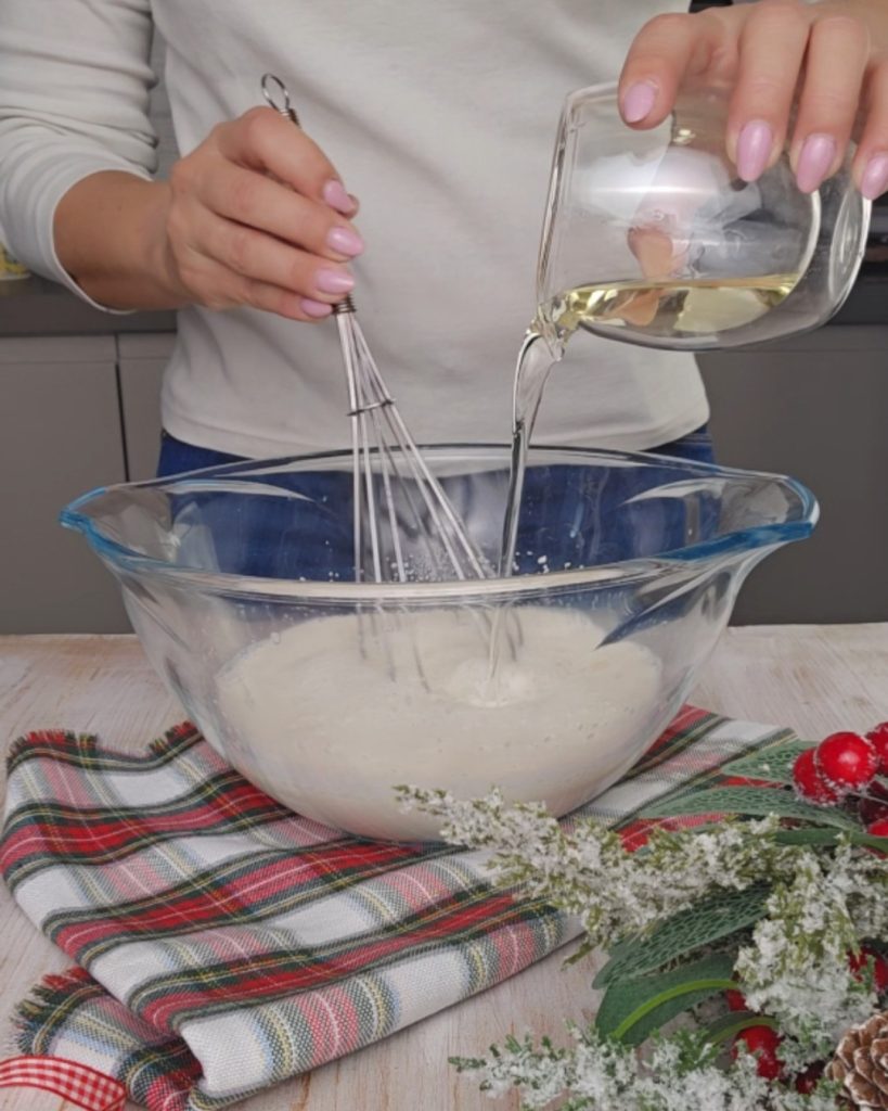 No recipiente grande, despeje o leite, o fermento, o açúcar, o óleo e misture energicamente, em seguida, aos poucos, incorpore também o sal e as farinhas, continuando a mexer.