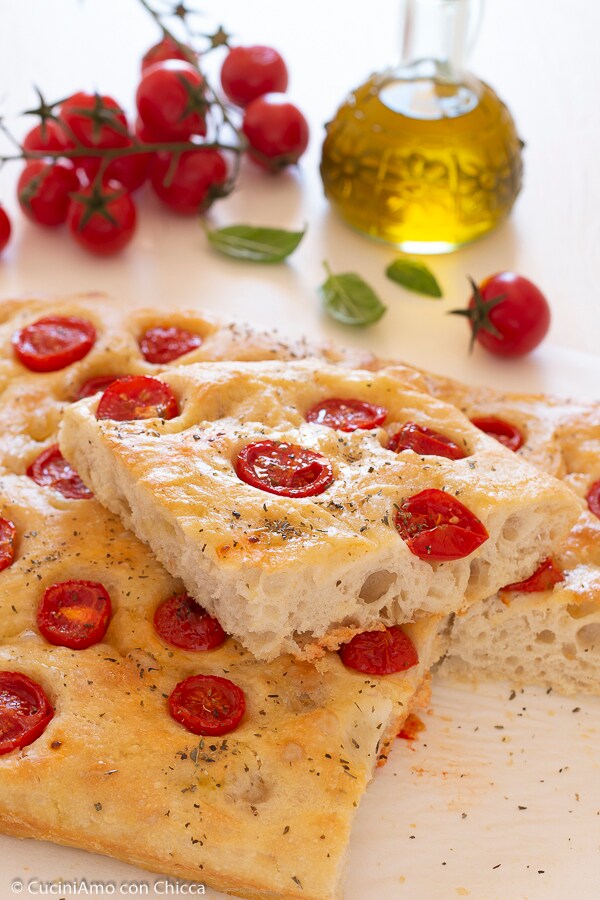 A focaccia sem amassar com tomatinhos é realmente simples, não precisa de amassar e de longos processos! Eu a recheei com tomatinhos e salmoura, mas você pode adicionar qualquer coisa: anchovas, salsichas e azeitonas. Nesta receita explicarei os passos simples para fazer uma focaccia crocante por fora, altíssima e macia por dentro e sem usar a batedeira. Você já experimentou a minha focaccia à pizzaiola e a focaccia recheada com cebola.