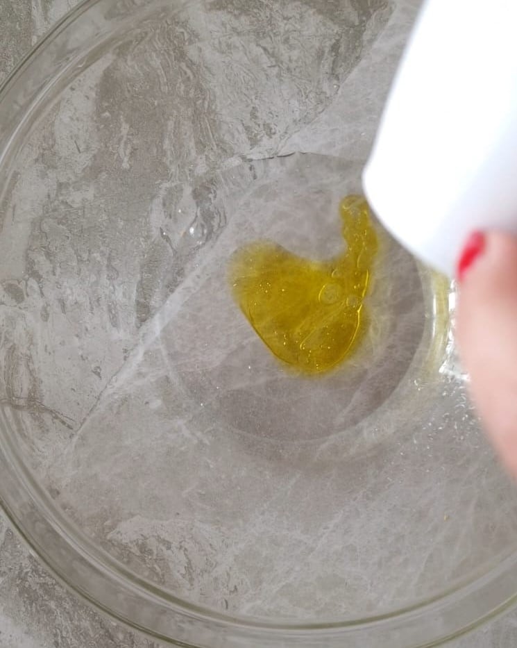 Em uma tigela, coloque a água e o azeite, depois adicione uma pitada de sal e misture com um garfo.