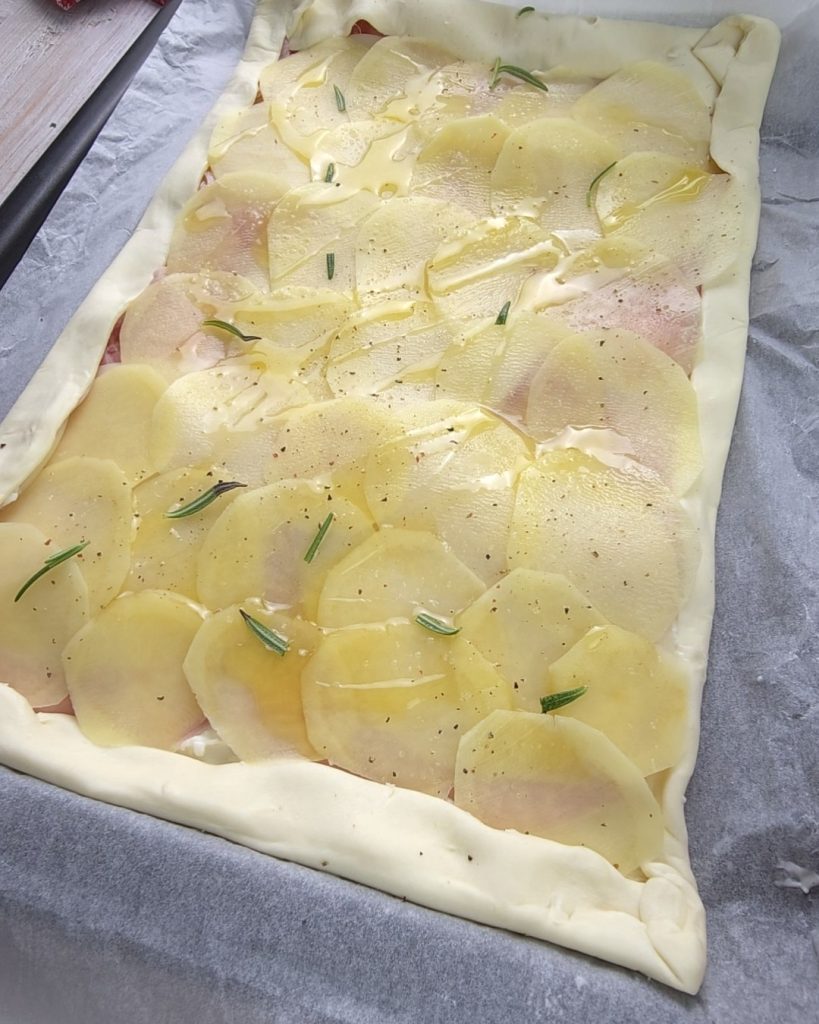 • Em seguida, lave e corte as batatas em fatias bem finas e coloque-as sobre o folhado recheado.