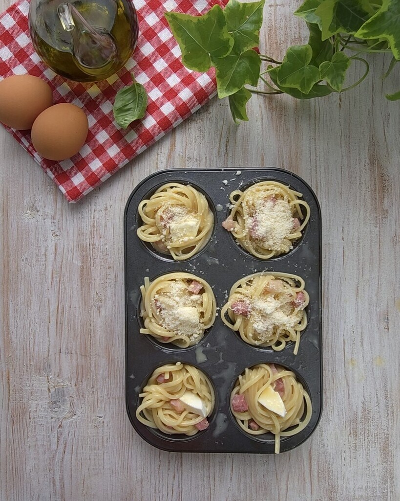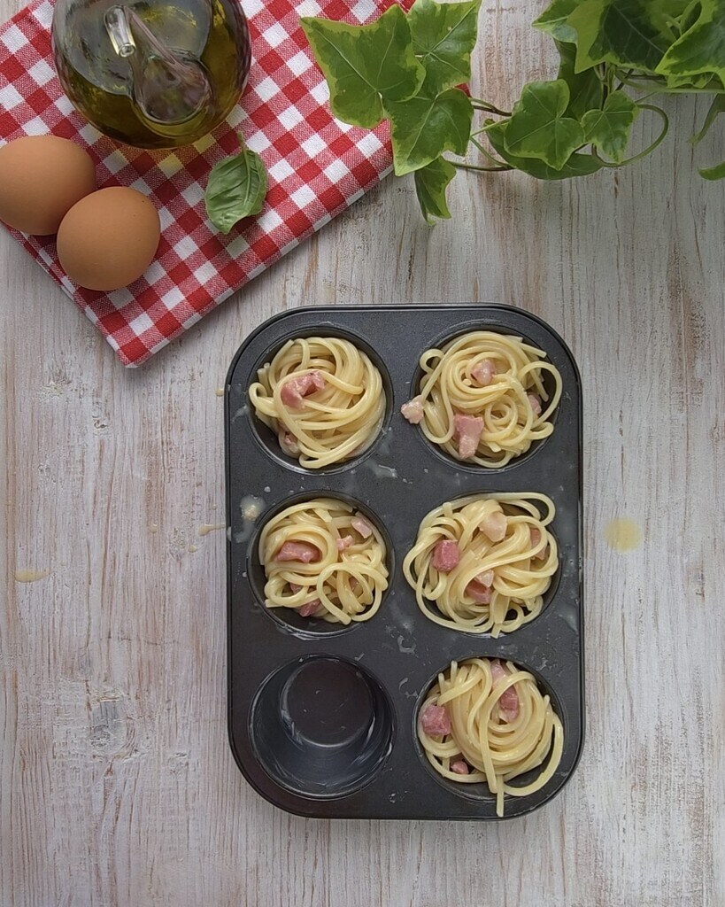 Com um garfo, transfira os espaguetes enrolados para as formas de muffin, criando ninhos. Se sobrar líquido no fundo da tigela, despeje também nas forminhas.