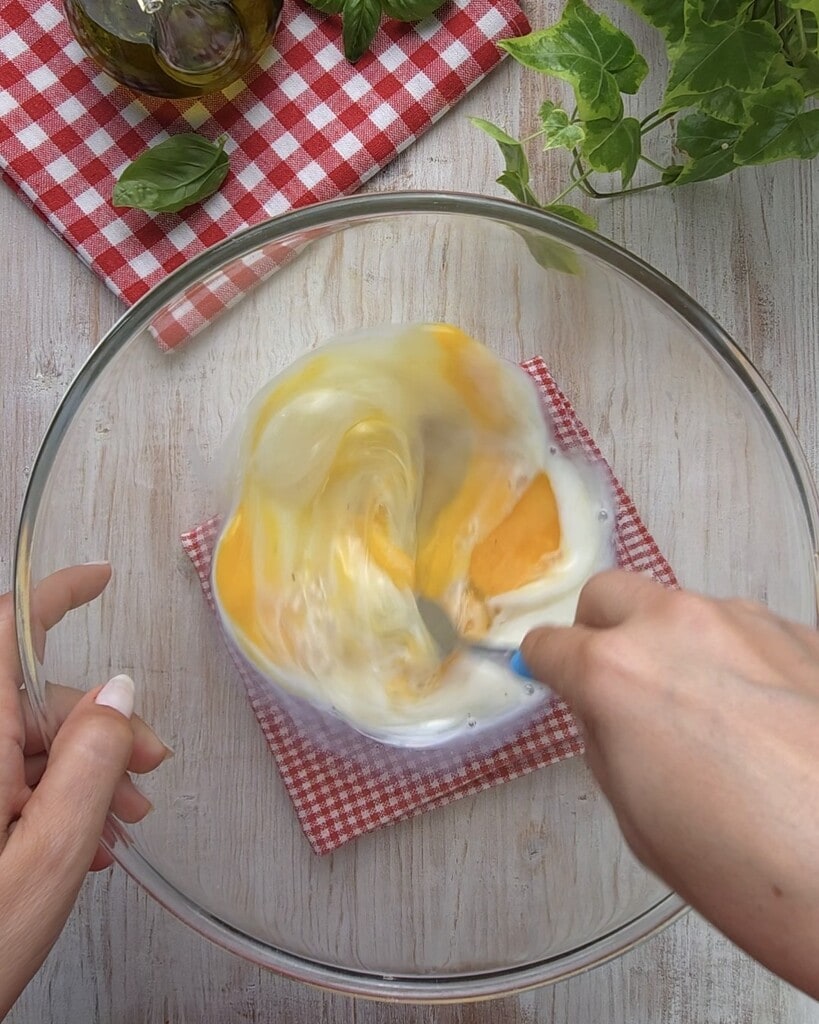 Em uma tigela, adicione os ovos, o leite e misture, adicione o parmesão ralado e o sal.