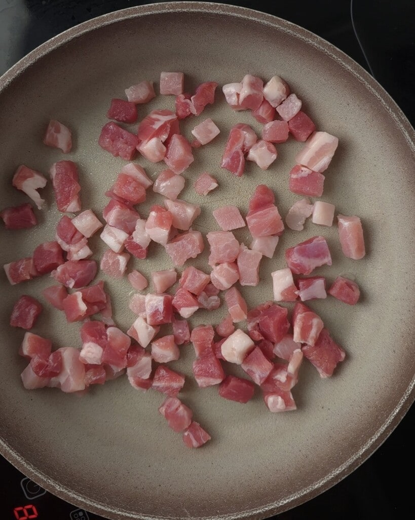 Na frigideira, doure o bacon cortado em cubos, depois deixe esfriar.