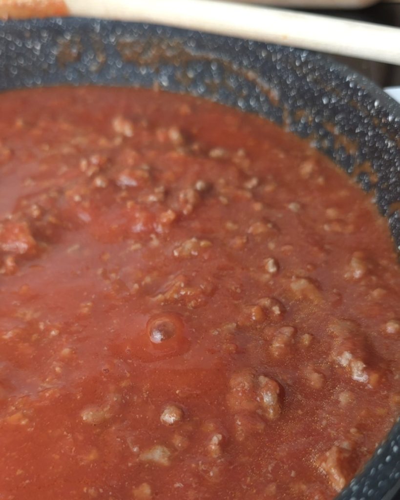 Despeje o vinho e deixe evaporar, acrescente o molho de tomate e cozinhe por 30 minutos.