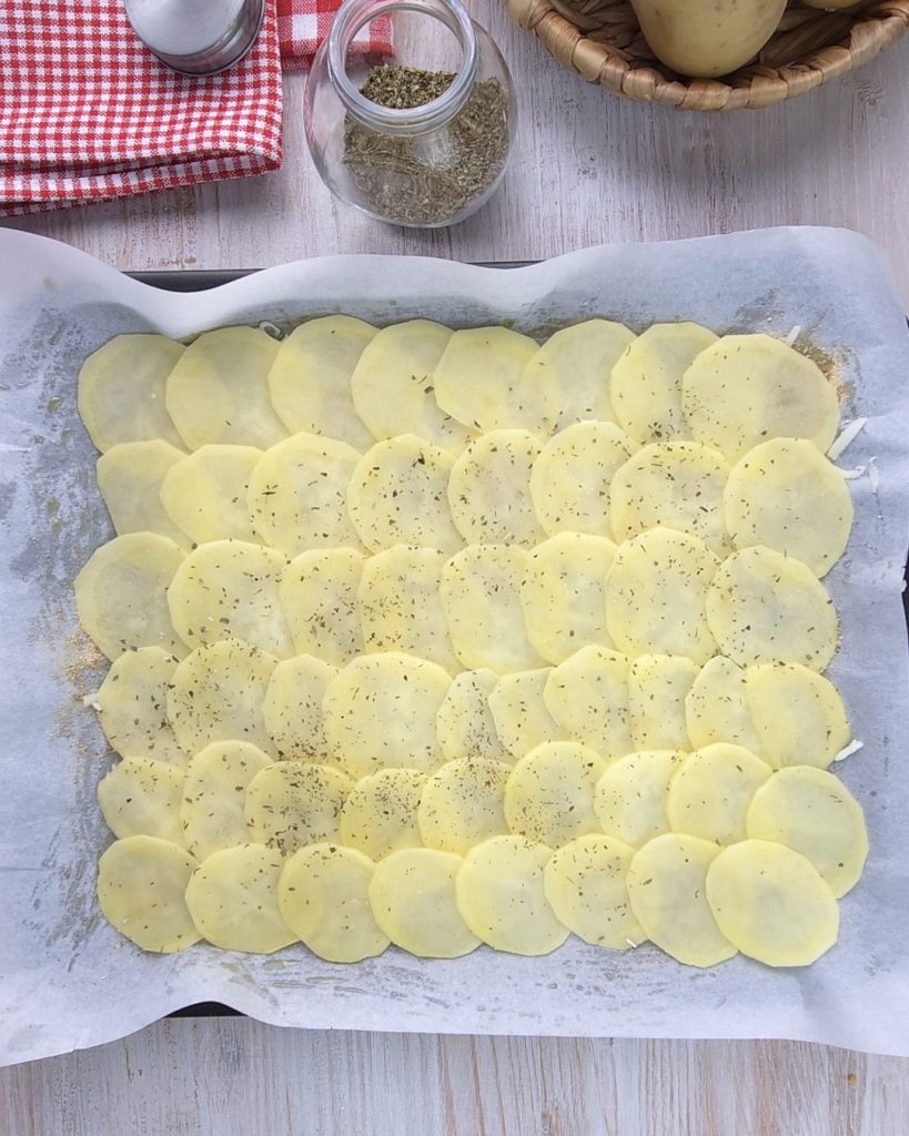 Lave e descasque as batatas, corte-as em fatias com uma mandolina ou cortador, com cerca de 5 mm de espessura.Neste ponto, forre uma assadeira com papel manteiga, unte-a e polvilhe com a farinha de rosca. Em seguida, distribua o queijo ralado e coloque as batatas lado a lado. Tempere com sal e orégano.