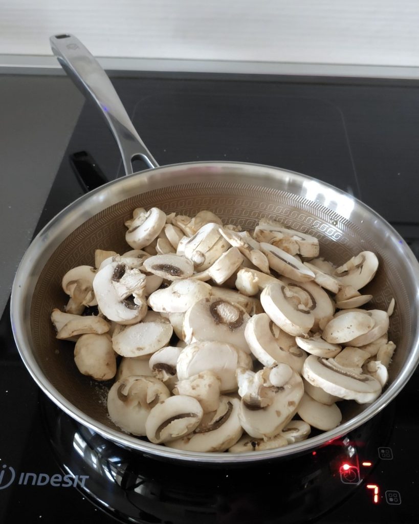 Refogue com um fio de óleo em uma frigideira com um dente de alho, adicione os cogumelos, sal e pimenta, deixe cozinhar por 7-8 minutos.