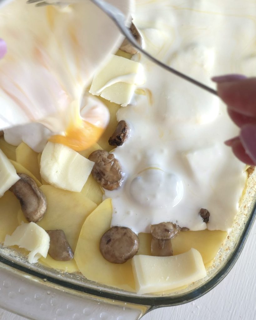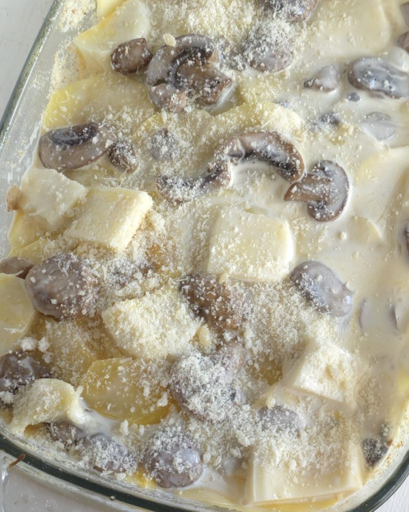 Adicione os cogumelos e o queijo, continue com outras camadas, alternando batatas, cogumelos e queijo.