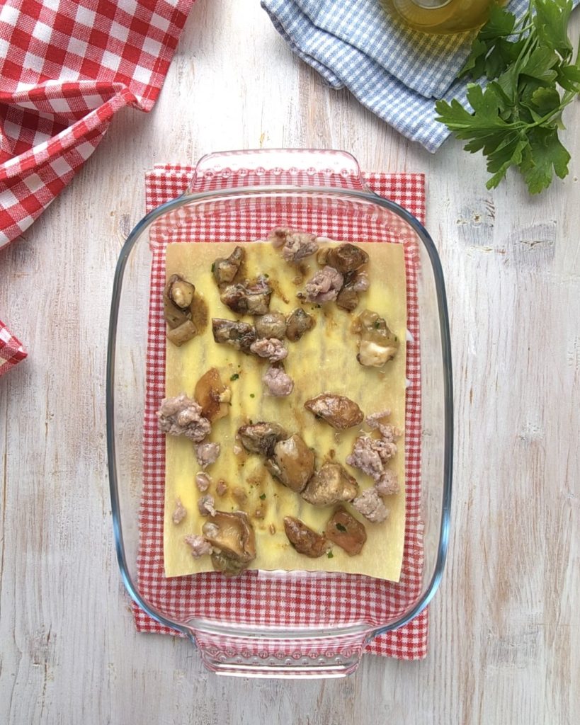 Coloque uma colher de molho bechamel no fundo de uma assadeira, adicione a massa folhada de ovos, os cogumelos e a linguiça.