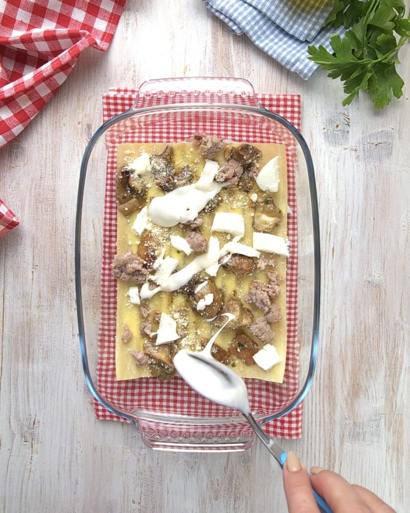 Em seguida, adicione mais massa de ovos, molho bechamel, cogumelos e os queijos, e repita todos os passos até acabar os ingredientes.