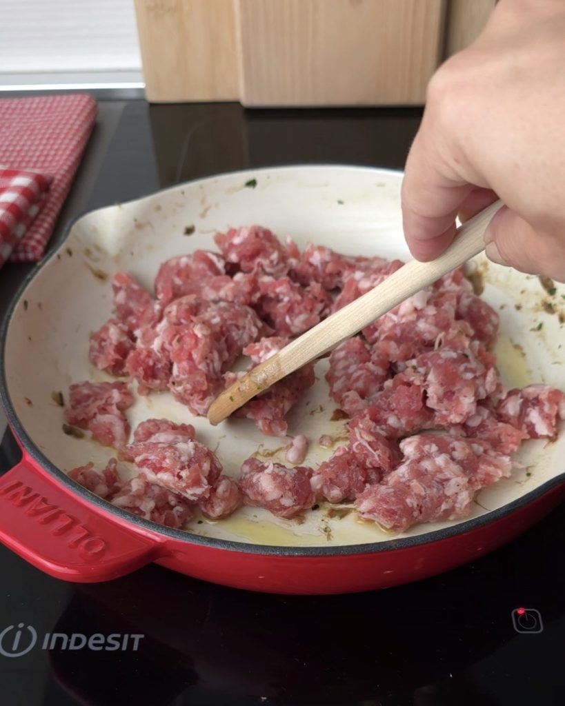Cozinhe por cerca de 10 minutos, depois tempere com sal e salsinha, misture bem e termine de cozinhar. Retire os cogumelos e na mesma panela doure a linguiça esfarelada até dourar, mexendo-a frequentemente. Regue com o vinho e deixe evaporar.