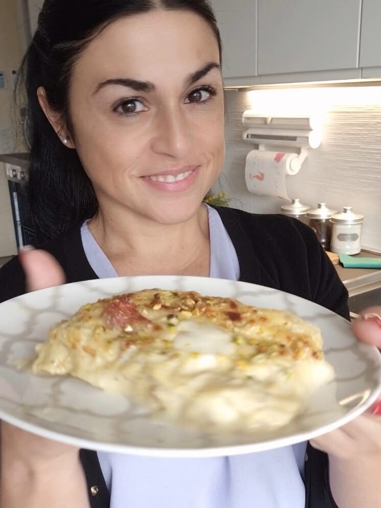 Na última camada, polvilhe com bastante granulado de pistache e o parmesão ralado para formar a crosta.