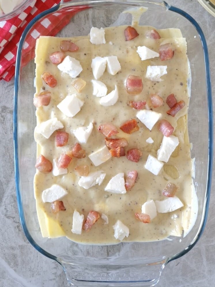 Coloque um pouco de molho bechamel no fundo de uma assadeira e comece a montar tudo, depois coloque a massa folhada, adicione o bacon crocante e a muçarela cortada em pedaços.