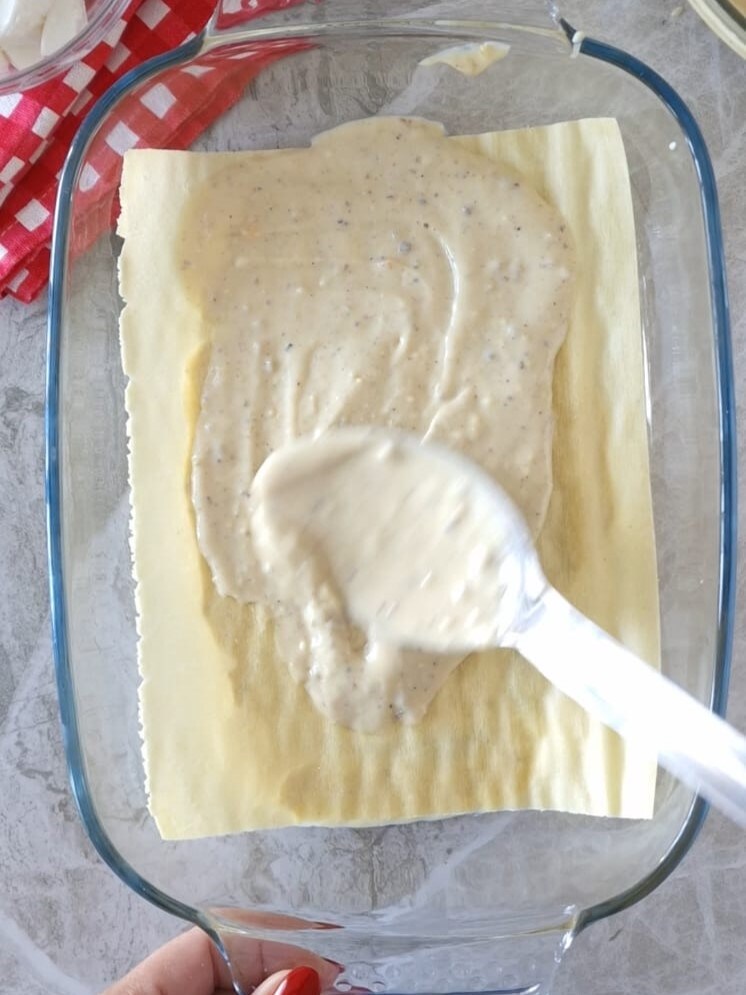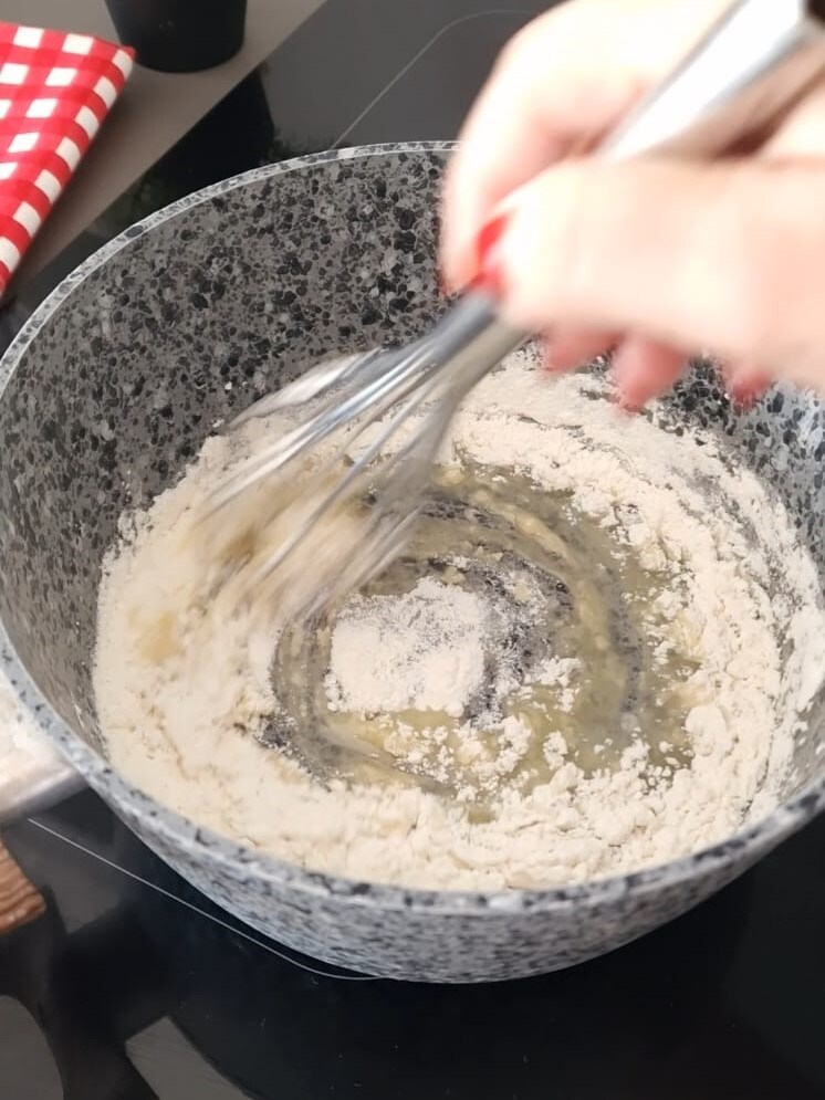 Em seguida, coloque novamente no fogo e mexa até ficar dourado. Agora que você obteve o roux, adicione o leite quente e tempere com uma pitada de noz-moscada e um pouco de sal, então mexa até engrossar, o que levará cerca de 10 minutos.