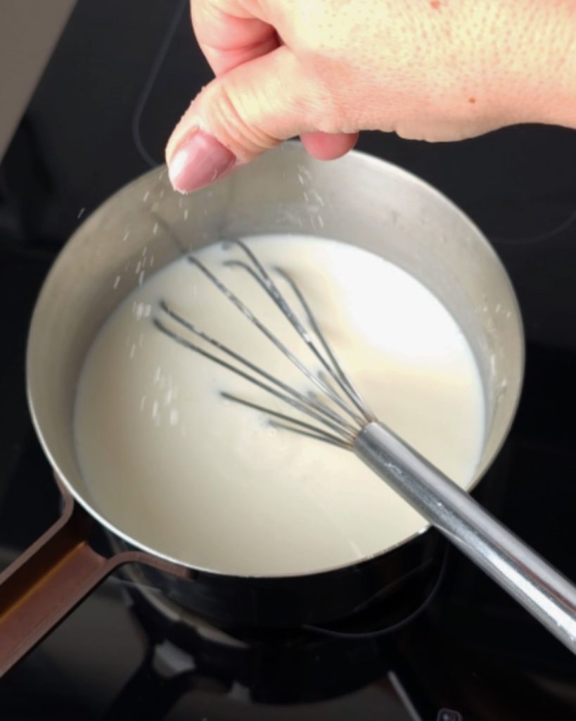 Coloque novamente no fogo e mexa até dourar. Uma vez obtido o roux, adicione o leite quente e tempere com uma pitada de noz-moscada e sal.