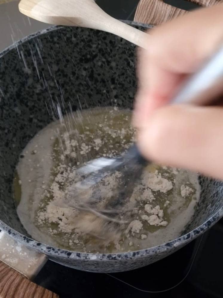 Em seguida, desligue o fogo e adicione a farinha peneirada aos poucos, mexendo com um batedor para evitar a formação de grumos.