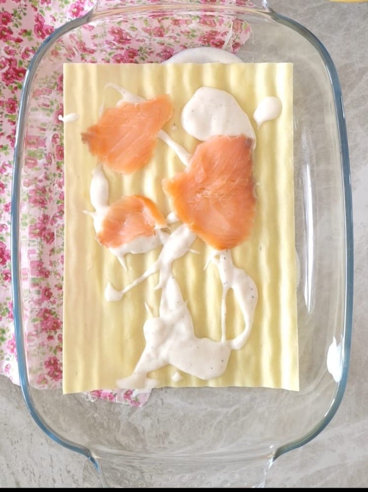Em seguida, adicione uma camada de bechamel, a muçarela em cubos e o salmão em tiras.