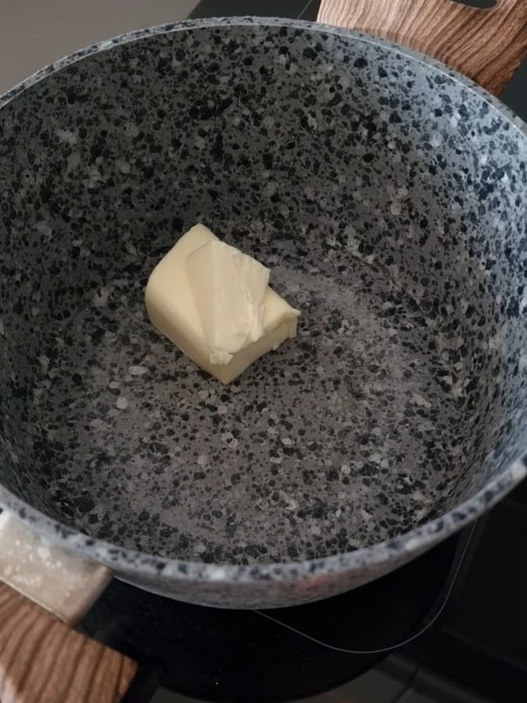 Primeiro, prepare o molho bechamel, colocando a manteiga para derreter em fogo baixo.