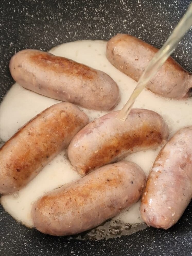 Cozinhe por cerca de 10 minutos, depois adicione a cerveja, deixe evaporar e continue o cozimento.
