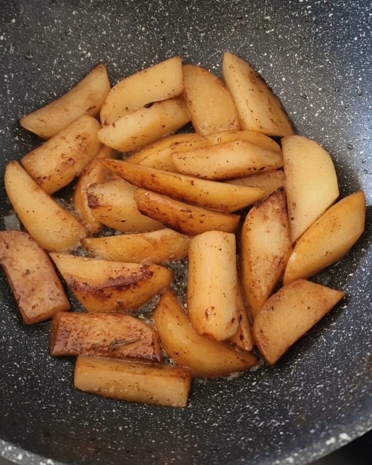Na mesma panela em que cozinhou as linguiças, coloque as batatas e os dentes de alho. Adicione sal e pimenta e doure em fogo médio por cerca de 15 minutos ou até dourar.