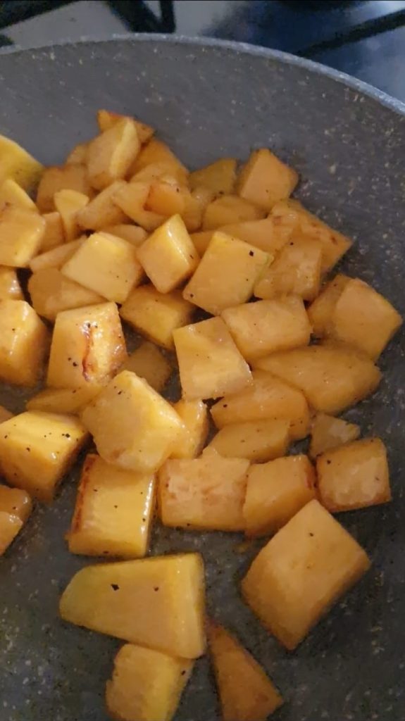 Comece limpando a abóbora: retire as sementes e a casca, corte em cubinhos e depois doure na frigideira com um fio de azeite e um dente de alho.