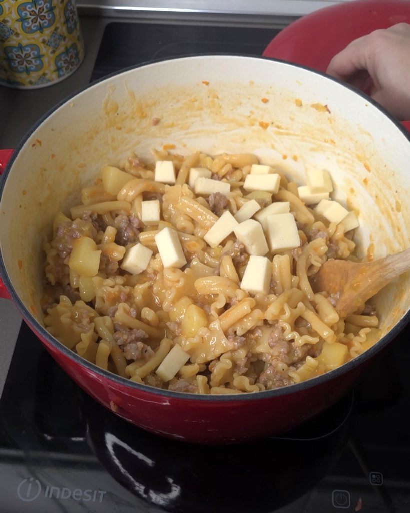 Após o tempo de cozimento do macarrão, adicione o provolone cortado em pedaços