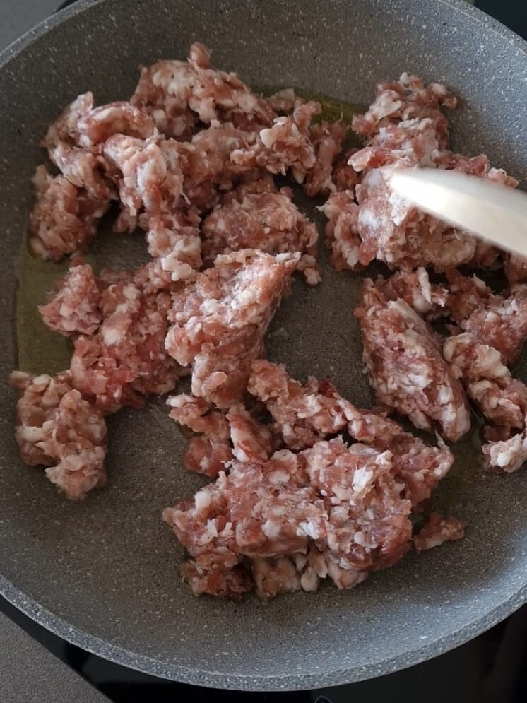 Doure a linguiça com um fio de azeite, adicione vinho e deixe evaporar.