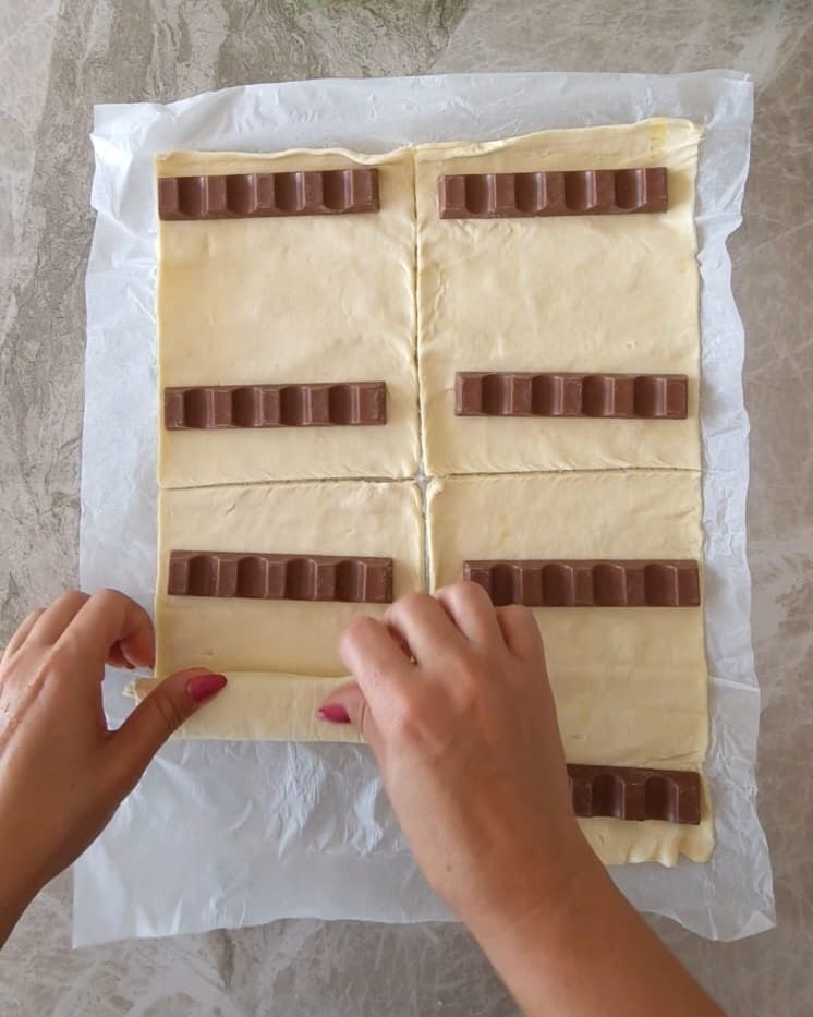 • Enrole cada pedaço envolvendo as barrinhas de chocolate na massa folhada.