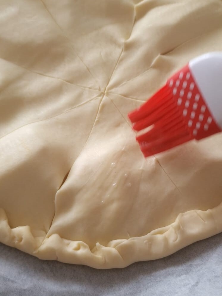 Desenrole o primeiro disco de massa, em seguida, com uma faca, faça porções cortando levemente a massa, mas sem cortar completamente o pedaço.
