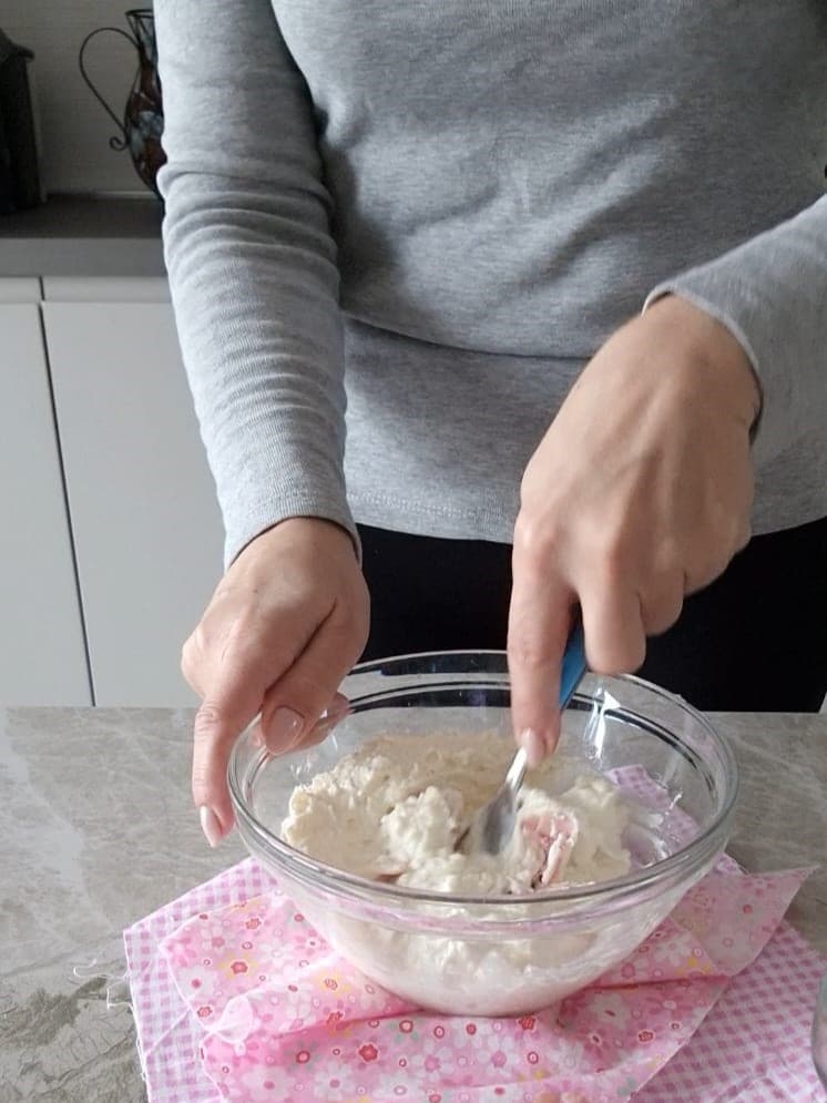 Em uma tigela, misture a ricota com uma pitada de sal, azeite, o queijo parmesão ralado e o presunto cozido. Misture tudo para incorporar bem os sabores.