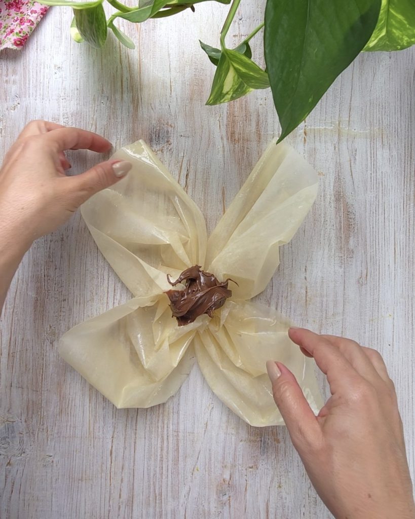 Recheie com Nutella, depois levante os 4 lados e feche o pacotinho.