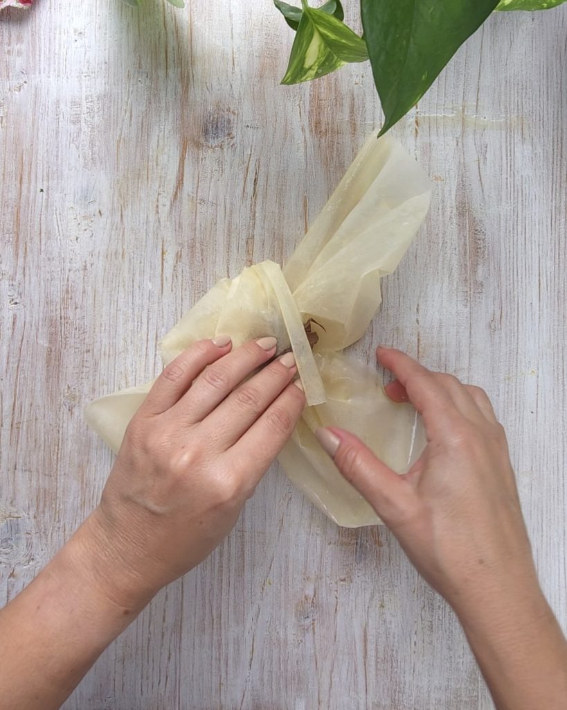 Uma vez obtidos todos os pacotinhos, disponha-os em uma assadeira forrada com papel manteiga e pincele com a manteiga restante.