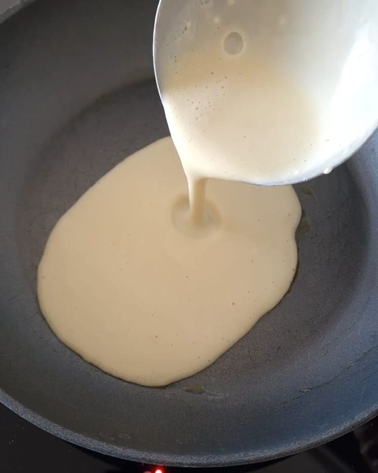 Após o tempo de descanso, aqueça uma frigideira antiaderente e unte com um pouco de óleo, então despeje uma concha de massa e incline e gire a frigideira para distribuir a mistura de maneira uniforme.