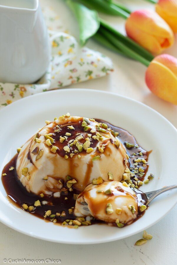 Após o tempo de repouso, retire sua panna cotta das formas e sirva com cobertura de caramelo e granulado de pistache.