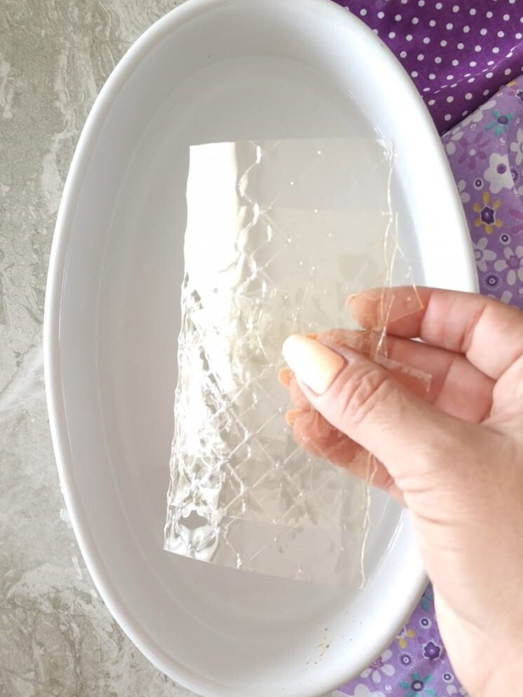 Primeiro, coloque as folhas de gelatina (cola de peixe) de molho em água fria, por no mínimo 10 minutos.