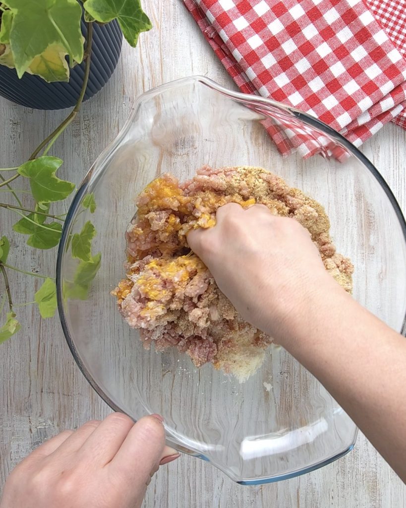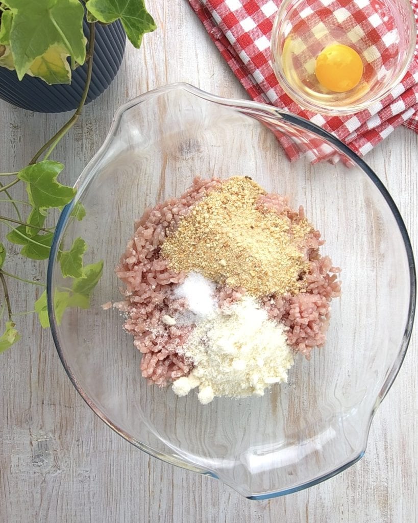 • Em uma tigela coloque a carne moída, o ovo, o parmesão e o sal.