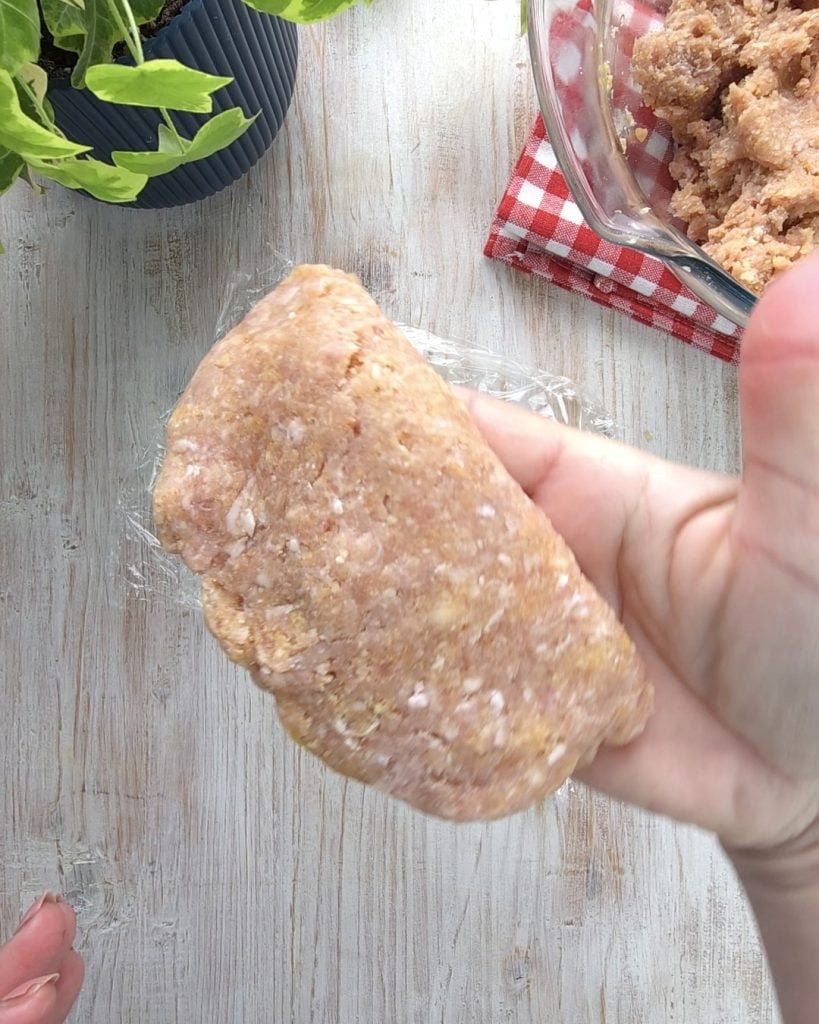 • Pegue um pouco da massa e modele com as mãos dando a forma de grandes almôndegas.