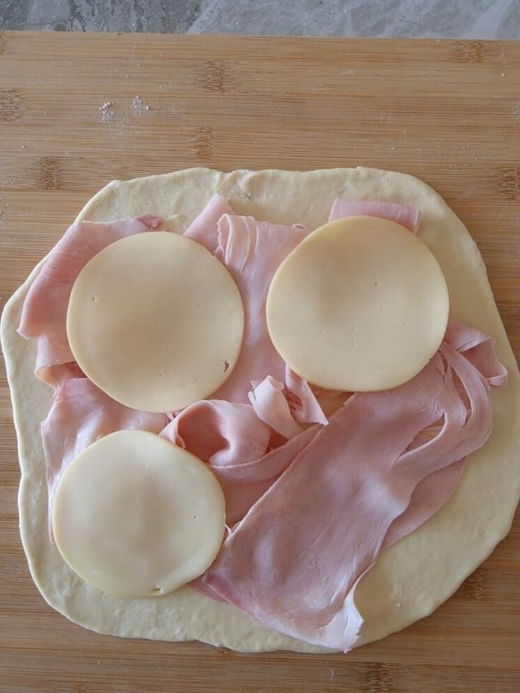 Recheie a base com o presunto cozido e o queijo em fatias. Cubra com a segunda folha e feche bem ao longo das bordas.