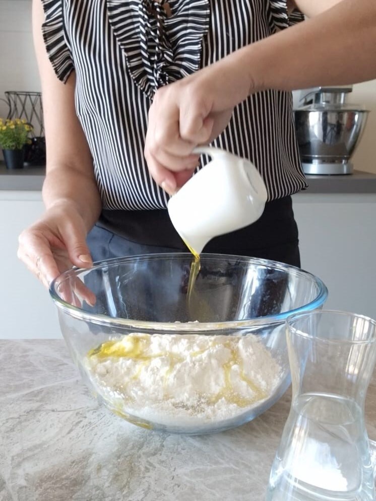 Em uma tigela grande, coloque a farinha, despeje o azeite, o sal, a água aos poucos.