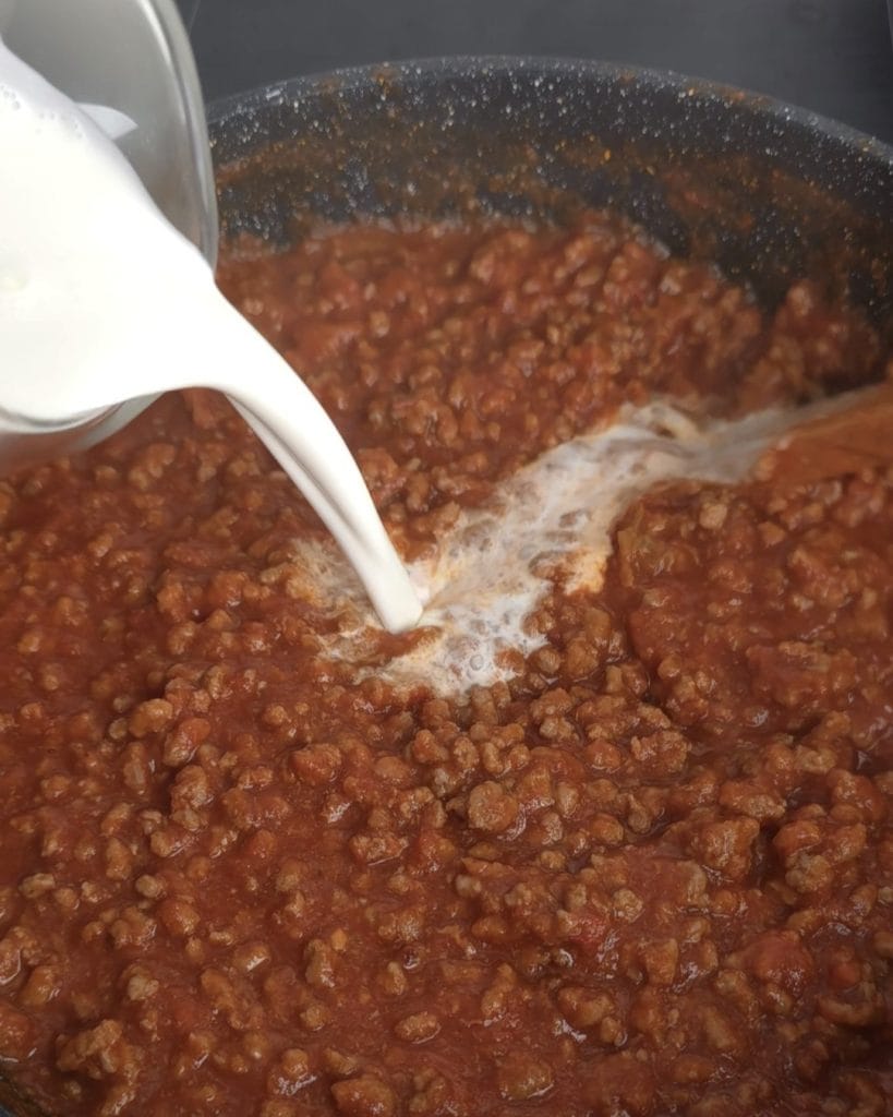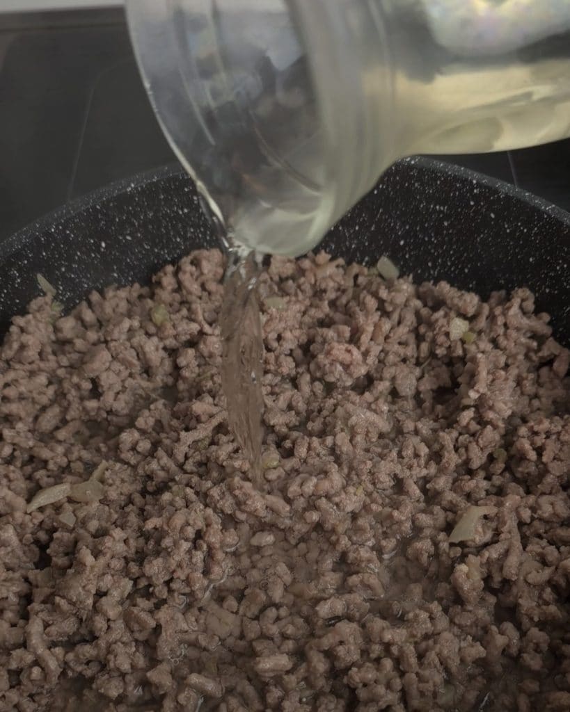 • Adicione a carne moída e cozinhe por cerca de 10 minutos, despeje o vinho e deixe evaporar.