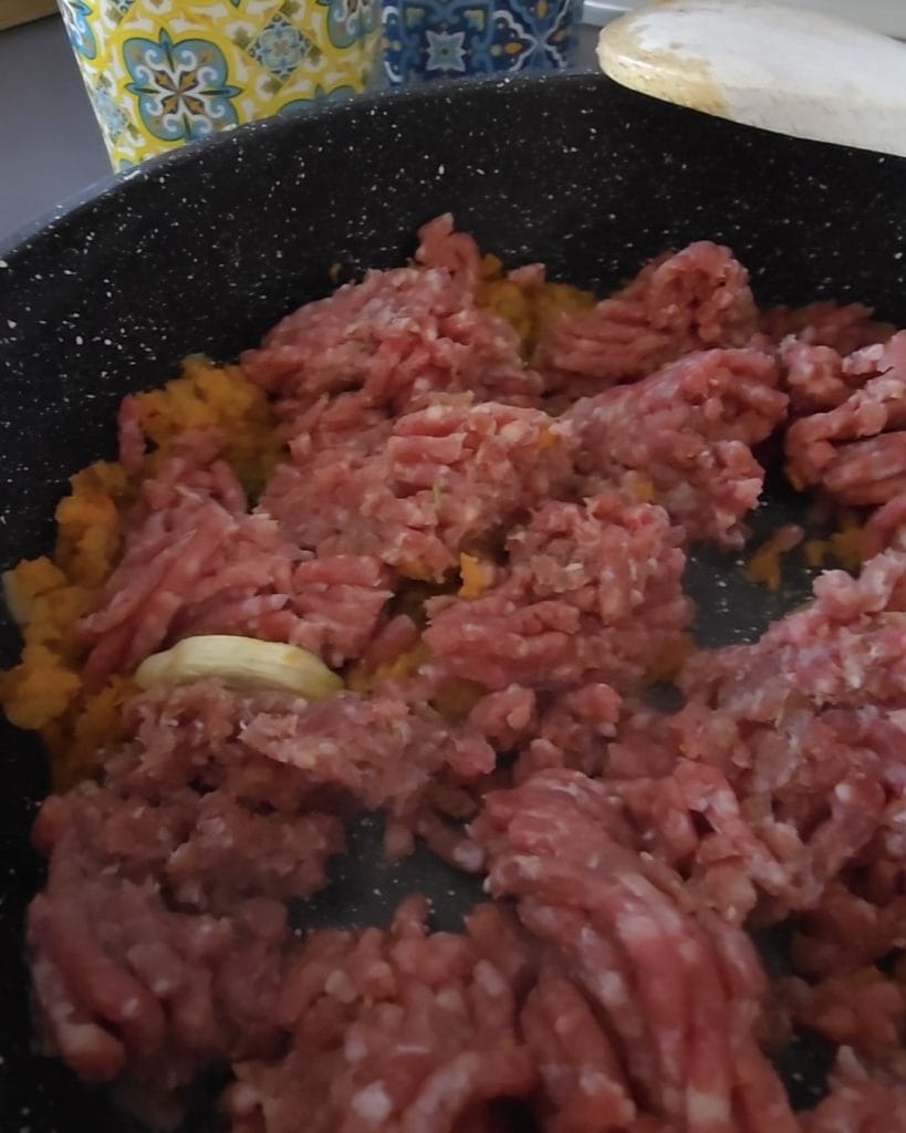 Adicione a carne moída e deixe dourar bem. Quando a carne estiver bem dourada, regue com vinho branco.