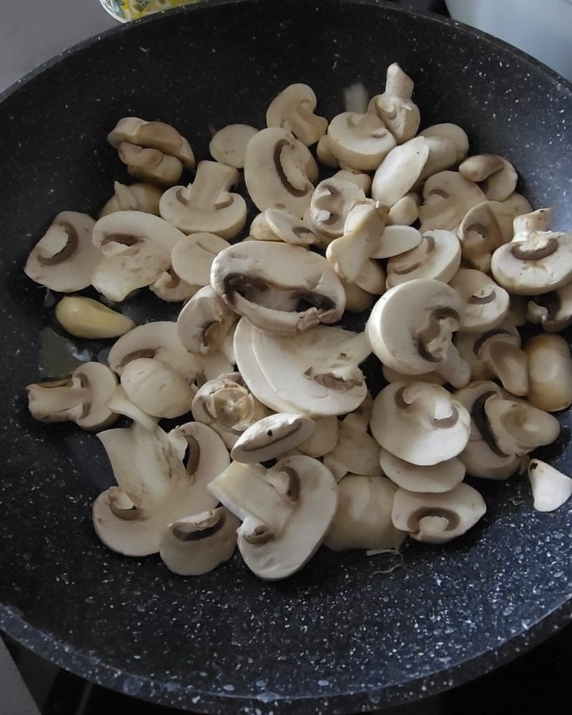 Enquanto isso, em outra frigideira, doure os cogumelos com um fio de azeite e o speck cortado em tiras.